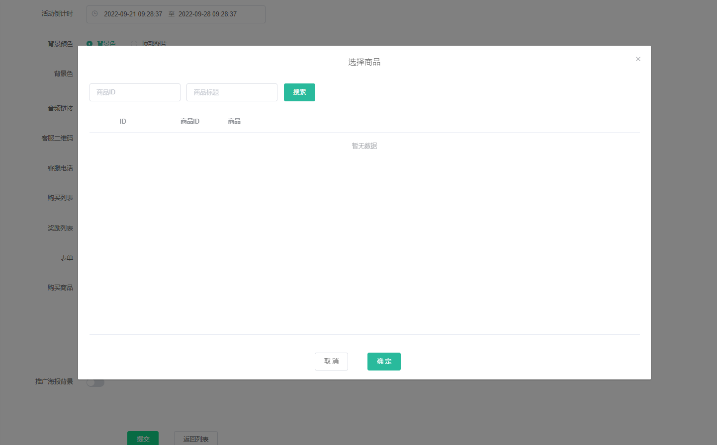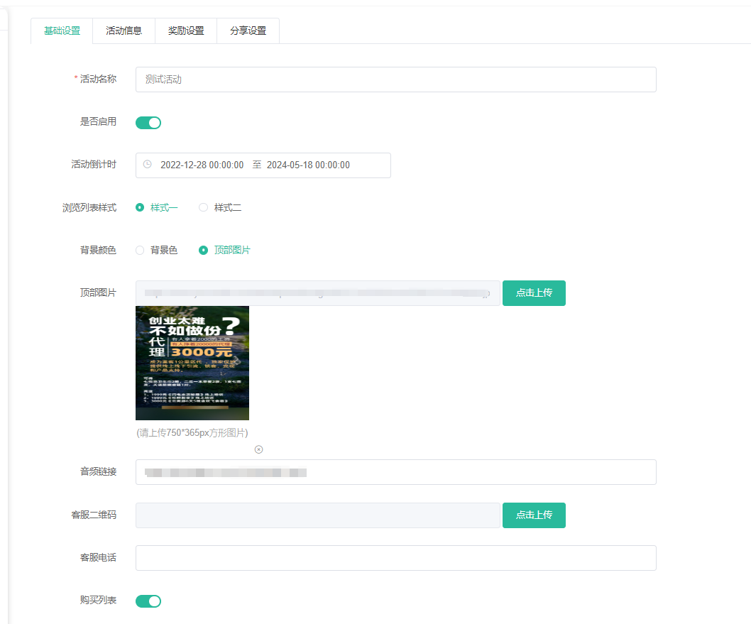 基础设置页面支持设置活动名称、时间、顶部图片(请上传750x365px方形图片)、背景音乐、客服二维码、电话、是否开启购买列表和奖励列表、表单及购买商品等
