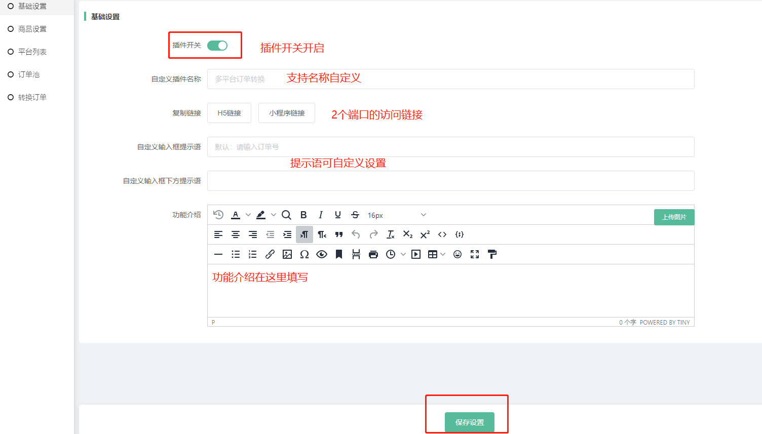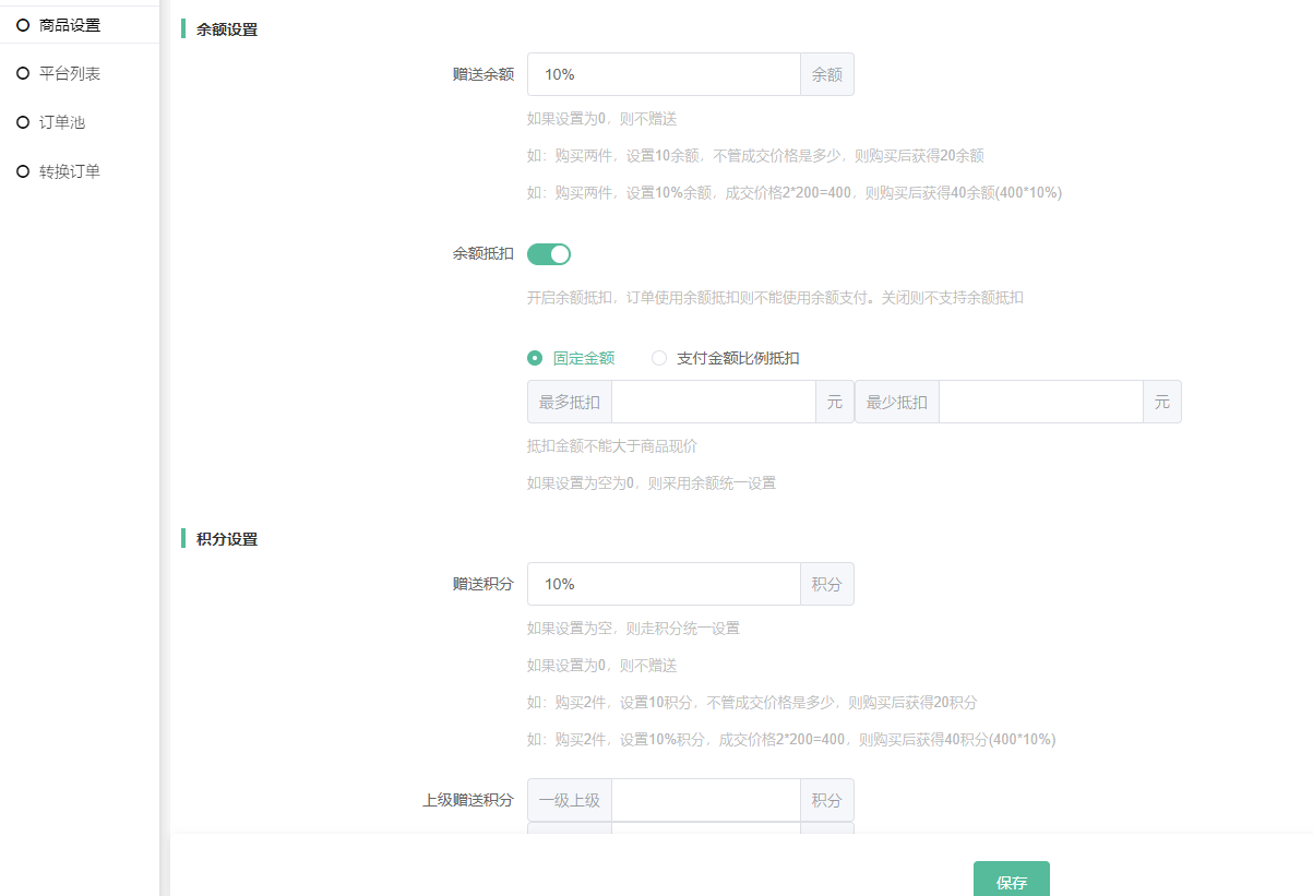 注意事项:因该功能的订单相当于虚拟商品订单(已完成状态),因此在营销设置和分润设置中,部分涉及实体订单、订单分润等的设置,是暂不支持执行的。