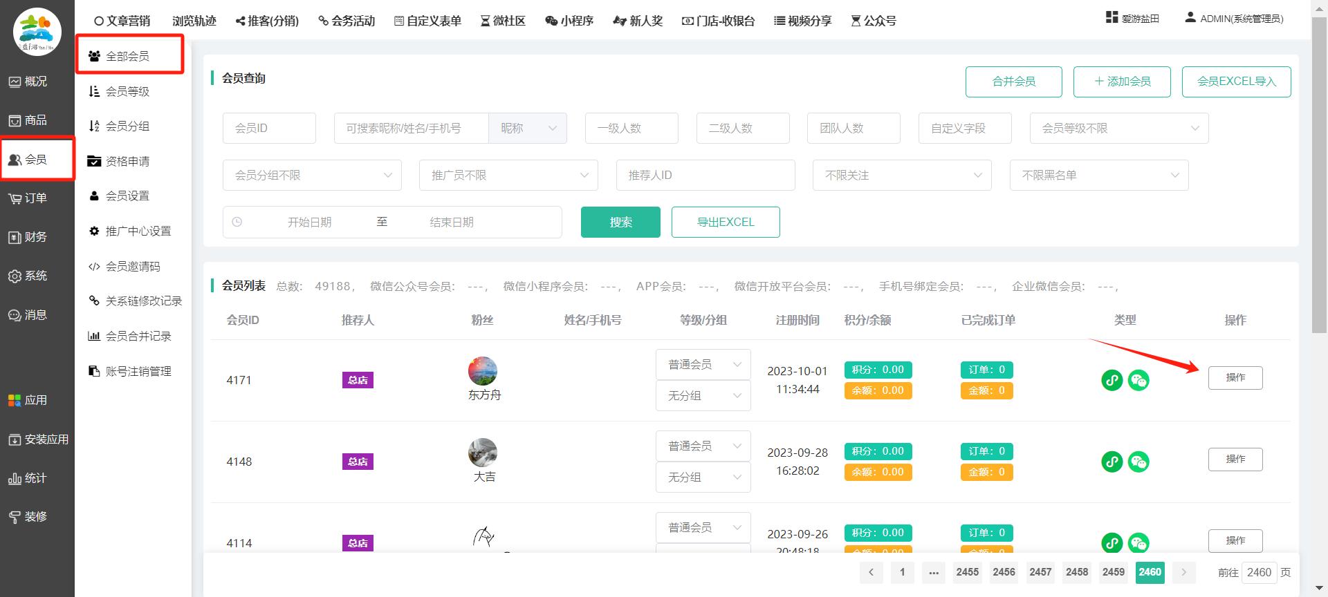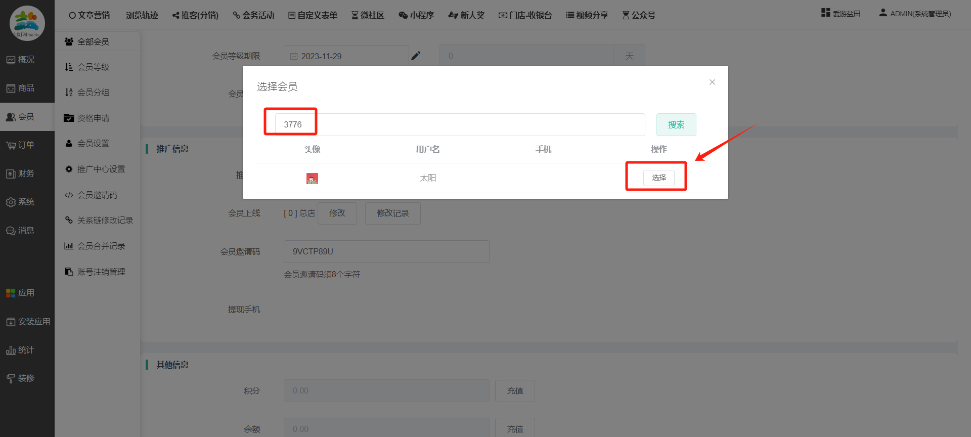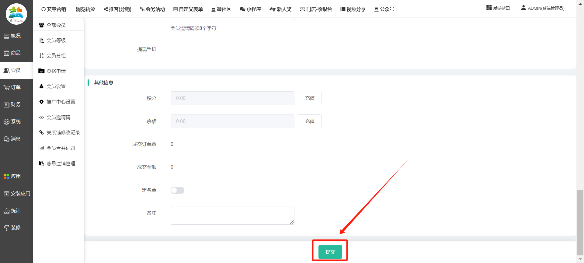 目录 搜索 展开 一、前期准备资料二、数字乡村码-上线操作指南1、服务号的申请流程及认证2、申请小程序流程3、开放平台绑定小程序和公众号三、数字乡村码-系统操作数字乡村码系统管理-概况数字乡村码-商品管理1、发布商品2、商品列表3、商品表单4、商品分类5、品牌管理6、配送模板7、评论管理8、优惠券管理9、商品标签10、退货地址设置11、满额优惠12、批量操作13、配送方式14、基础设置15、商品隐藏四、数字乡村码-会员管理1、全部会员2、会员等级3、会员分组4、资格申请5、会员设置6、推广中心设置7、会员邀请码8、会员关系链修改关系链修改记录9、会员合并记录10、账号注销管理11、会员设置中心五、数字乡村码-订单管理1、订单管理列表2、订单处理流程3、订单状态4、订单修改价格5、订单退款退货6、多包裹发货7、批量发货订单操作步骤8、催发货订单9、物流查询六、数字乡村码-财务管理1、余额设置2、会员余额3、充值记录4、转让记录5、余额明细6、收入明细7、提现设置8、提现统计9、积分管理10、转账审核11、收益广告12、批量充值七、数字乡村码-系统管理1、商城入口2、商城设置①、商城设置②、订单设置③、物流查询④、短信⑤、联系方式⑥、分类⑦、优惠券⑧、分享⑨、幻灯片⑩、广告位⑫、地图设置3、交易设置4、微信模板消息自定义消息模板(新版)自定义消息模板(旧版)小程序消息模板公众号模板消息变更公告5、语言设置6、权限管理7、多媒体管理八、数字乡村码-消息管理九、数字乡村码-应用管理十、数字乡村码系统-数据统计十一、数字乡村码-页面装修DIY1、模板管理2、店铺页面3、顶部导航4、底部导航5、DIY模板市场6、首屏广告7、基础设置8、装修DIY尺寸建议十二、供应商功能插件操作指南1、供应商2、门店-收银台门店申请和使用步骤门店管理①、门店-收银台 营销设置②、门店-收银台 分润设置门店分类门店申请门店审核门店商品门店商品订单收银台订单数据统计核销员基础设置默认设置门店装修3、微社区4、会务活动十三、营销插件操作指南活动报名提货卡新人奖微店问卷调查积分视频分享1、视频分享基础设置2、视频分享发现管理3、视频分享分类管理4、视频分享评论管理5、视频分享分红记录6、视频分享短视频中心每日红包幸运大抽奖签到优惠券二维码任务奖励优惠劵文章音频文章付费文章限时购新海报拓客卡操作流程积分活动素材中心视频红包十四、入驻门店应用类1、门店预约2、附近商品3、门店定位设置4、门店控制5、门店满额包邮6、门店满额减7、导入商品8、门店搜索9、门店股东10、核销券11、多门店核销1、商城后台设置2、前端功能演示十五、常见问题1、后台登录密码修改流程2、会员-余额,积分,后台如何进行充值与扣除3、如何修改上下级关系4、一种万能的获取商城小程序路径的方法 暂无相关搜索结果! 阅读次数:1404 本文档使用 模王系统 发布 8、会员关系链修改 8、会员关系链修改一.如何修改上下级关系?1.会员-全部会员-可以通过搜索用户的独立ID,或者用户微信昵称,找到此会员,然后点击右边的(操作)2.再点击会员详情。3.滑到下面,有个推广信息-会员上线,点击修改4.输入上级的ID号,点击搜索,出来此上级会员后点击选择。5.滑到最下面,一定要点击提交按钮。文档更新时间: 2023-11-30 14:56 作者:链上旅行