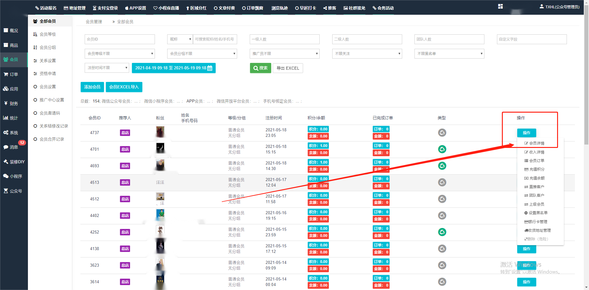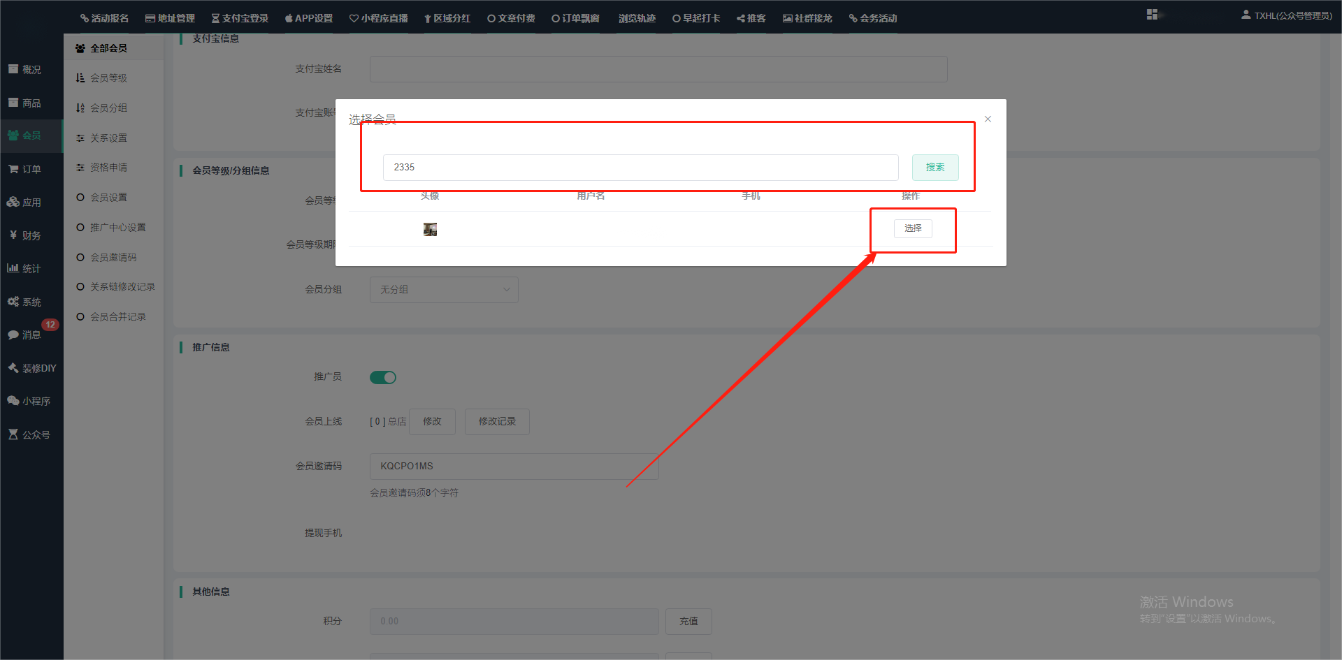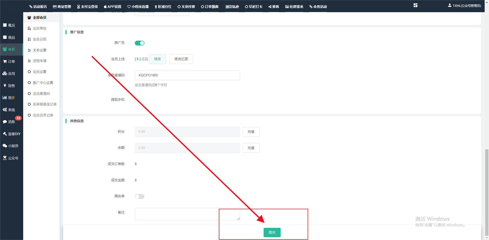 目录 搜索 展开 一、前期准备资料二、数字乡村码-上线操作指南1、服务号的申请流程及认证2、申请小程序流程3、开放平台绑定小程序和公众号三、数字乡村码-系统操作数字乡村码系统管理-概况数字乡村码-商品管理1、发布商品2、商品列表3、商品表单4、商品分类5、品牌管理6、配送模板7、评论管理8、优惠券管理9、商品标签10、退货地址设置11、满额优惠12、批量操作13、配送方式14、基础设置15、商品隐藏四、数字乡村码-会员管理1、全部会员2、会员等级3、会员分组4、资格申请5、会员设置6、推广中心设置7、会员邀请码8、会员关系链修改关系链修改记录9、会员合并记录10、账号注销管理11、会员设置中心五、数字乡村码-订单管理1、订单管理列表2、订单处理流程3、订单状态4、订单修改价格5、订单退款退货6、多包裹发货7、批量发货订单操作步骤8、催发货订单9、物流查询六、数字乡村码-财务管理1、余额设置2、会员余额3、充值记录4、转让记录5、余额明细6、收入明细7、提现设置8、提现统计9、积分管理10、转账审核11、收益广告12、批量充值七、数字乡村码-系统管理1、商城入口2、商城设置①、商城设置②、订单设置③、物流查询④、短信⑤、联系方式⑥、分类⑦、优惠券⑧、分享⑨、幻灯片⑩、广告位⑫、地图设置3、交易设置4、微信模板消息自定义消息模板(新版)自定义消息模板(旧版)小程序消息模板公众号模板消息变更公告5、语言设置6、权限管理7、多媒体管理八、数字乡村码-消息管理九、数字乡村码-应用管理十、数字乡村码系统-数据统计十一、数字乡村码-页面装修DIY1、模板管理2、店铺页面3、顶部导航4、底部导航5、DIY模板市场6、首屏广告7、基础设置8、装修DIY尺寸建议十二、供应商功能插件操作指南1、供应商2、门店-收银台门店申请和使用步骤门店管理①、门店-收银台 营销设置②、门店-收银台 分润设置门店分类门店申请门店审核门店商品门店商品订单收银台订单数据统计核销员基础设置默认设置门店装修3、微社区4、会务活动十三、营销插件操作指南活动报名提货卡新人奖微店问卷调查积分视频分享1、视频分享基础设置2、视频分享发现管理3、视频分享分类管理4、视频分享评论管理5、视频分享分红记录6、视频分享短视频中心每日红包幸运大抽奖签到优惠券二维码任务奖励优惠劵文章音频文章付费文章限时购新海报拓客卡操作流程积分活动素材中心视频红包十四、入驻门店应用类1、门店预约2、附近商品3、门店定位设置4、门店控制5、门店满额包邮6、门店满额减7、导入商品8、门店搜索9、门店股东10、核销券11、多门店核销1、商城后台设置2、前端功能演示十五、常见问题1、后台登录密码修改流程2、会员-余额,积分,后台如何进行充值与扣除3、如何修改上下级关系4、一种万能的获取商城小程序路径的方法 暂无相关搜索结果! 阅读次数:1426 本文档使用 模王系统 发布 3、如何修改上下级关系 如何修改上下级关系一.如何修改上下级关系?1.会员-全部会员-可以通过搜索用户的独立ID,或者用户微信昵称,找到此会员,然后点击右边的(操作)2.再点击会员详情。3.滑到下面,有个推广信息-会员上线,点击修改4.输入上级的ID号,点击搜索,出来此上级会员后点击选择。5.滑到最下面,一定要点击提交按钮。文档更新时间: 2024-01-05 14:50 作者:链上旅行