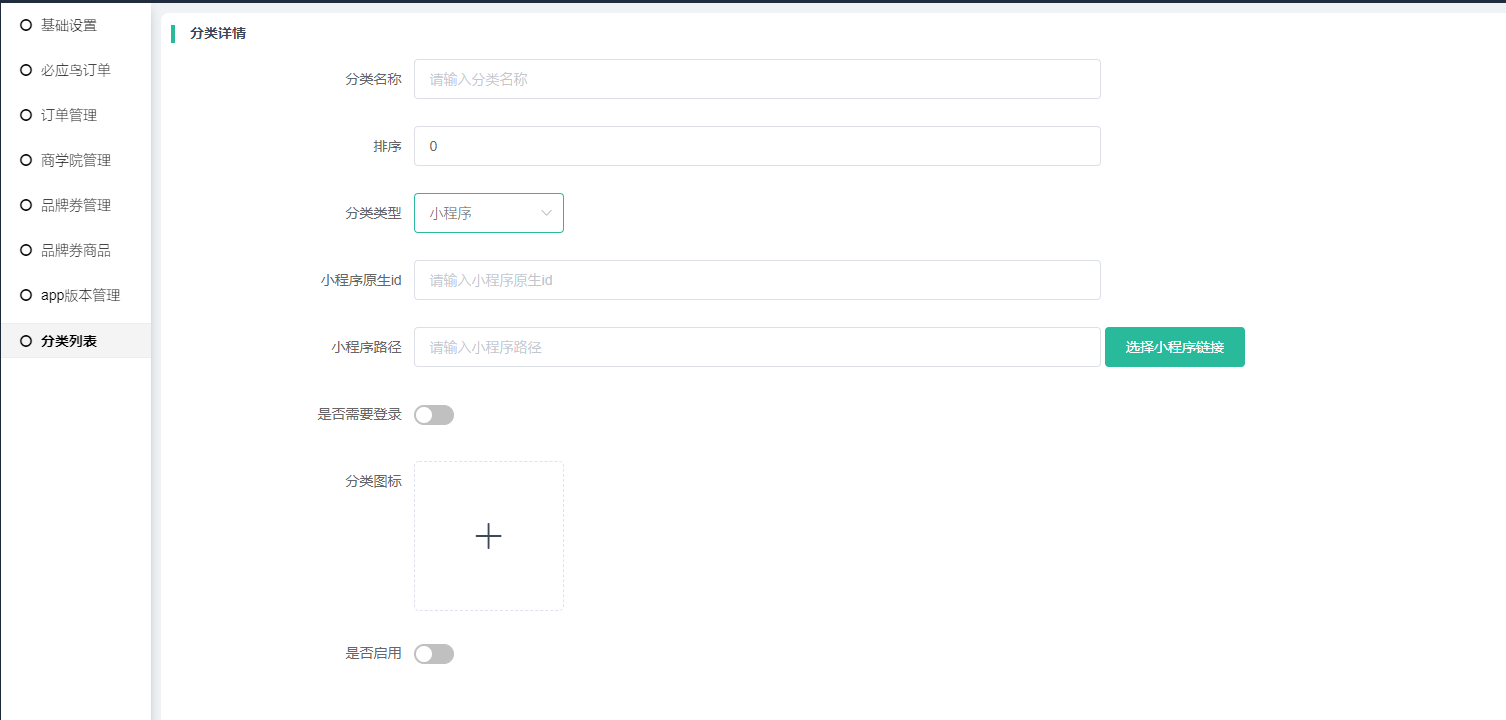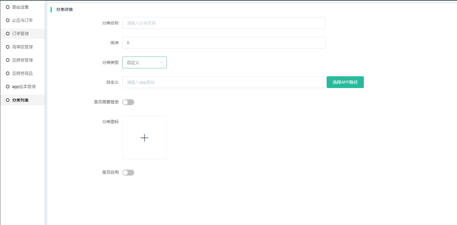 添加2级分类,名称、排序、图标、是否启用等规则同1、2级分类,关键在于区分不同的分类分类类型。