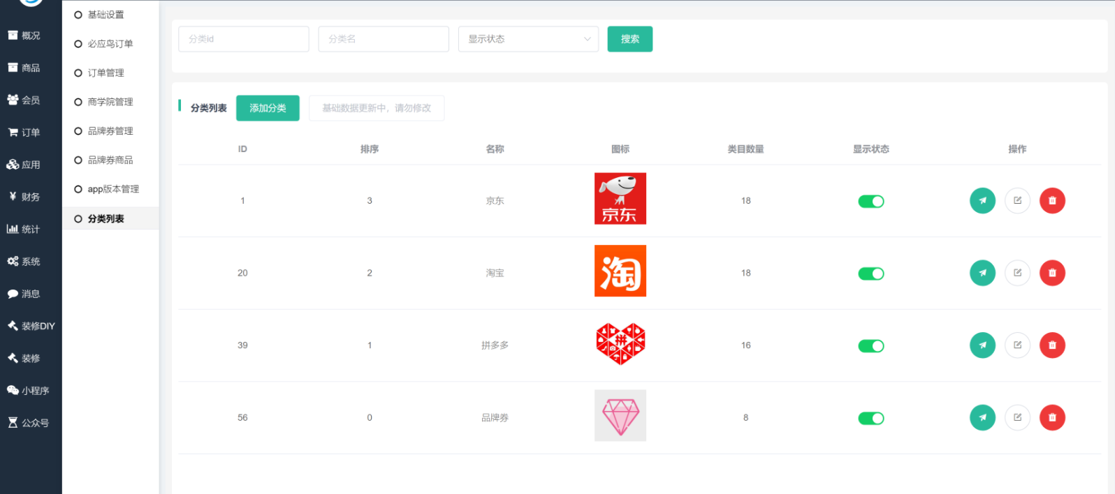 重要提示:初始化数据中包含药品类数据,如您不具备药品经营许可,请务必在初始化数据后删除药品相关类目数据,否则可能导致应用上架审核失败。在淘宝、拼多多两个大类下都存在医药类分类,可直接关闭显示状态即可!