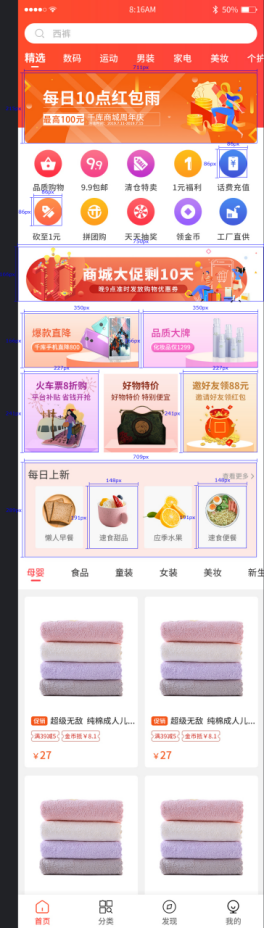 2.  一般图标尺寸可设计为100*100px、或者比100大、比100小的尺寸都可以、例如:84*84、200*200、尺寸没有具体的规范标准、形状为圆形或者正方形以及其他形状都可以、根据产品自身金刚区高度去设计,以线上设计稿为准,也可参考诸多app中的视觉大小,保持视觉统一和app首页的整体视觉舒适即可。